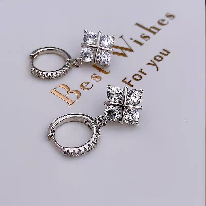 Graphic sparkle with a modern twist. Four round moissanites form a radiant square, crossed by a sleek X bar and suspended from pavé huggie hoops. Crafted in 925 sterling silver with a bright rhodium (white-gold tone) finish—fresh, hypoallergenic, and ready to dress up every look.