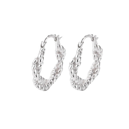 The twisted design not only enhances the earrings' visual depth but also gives them a sense of dynamic flow, as if the braid continuously wraps around the earlobe. The curves of the earrings are smooth, with variations in thickness, yet they maintain a harmonious balance, adding a three-dimensional and refined touch to the overall look.