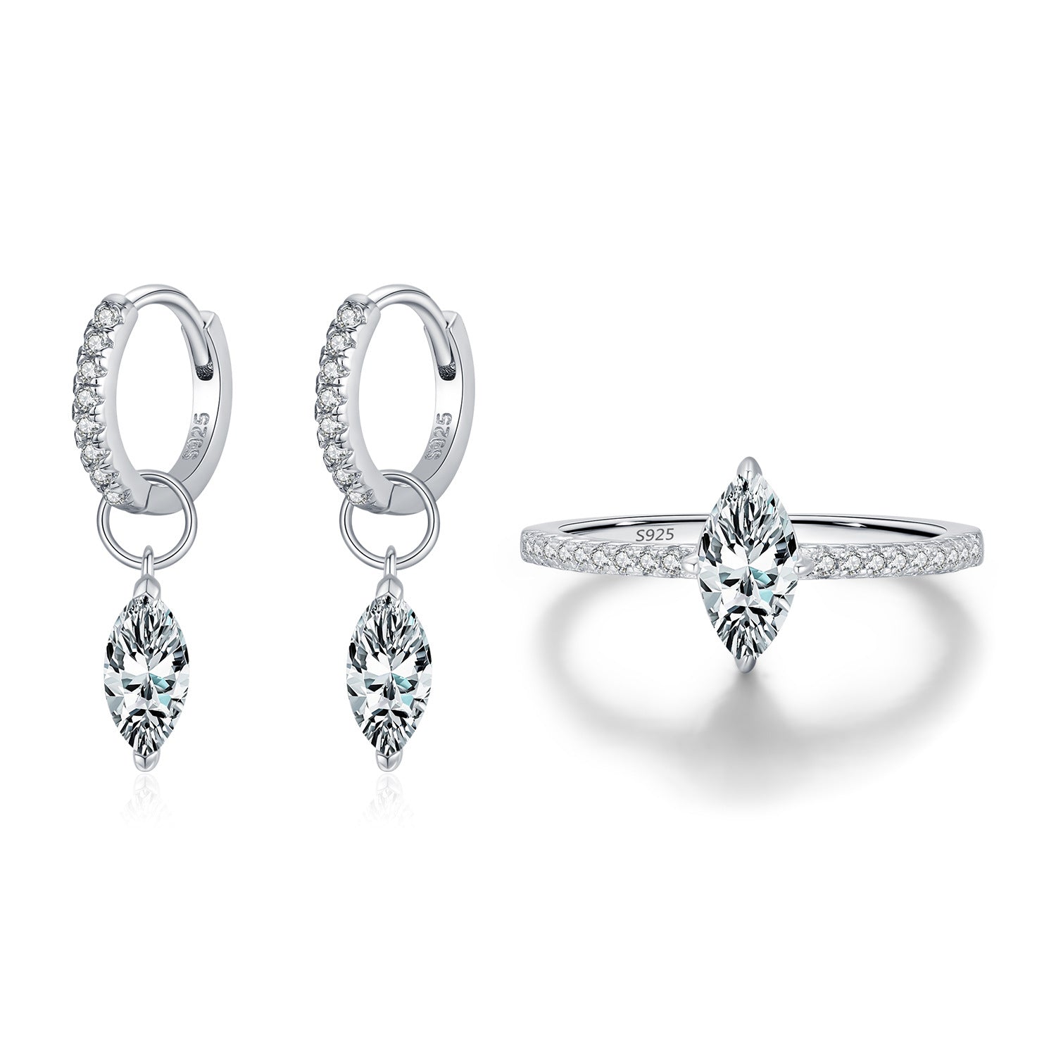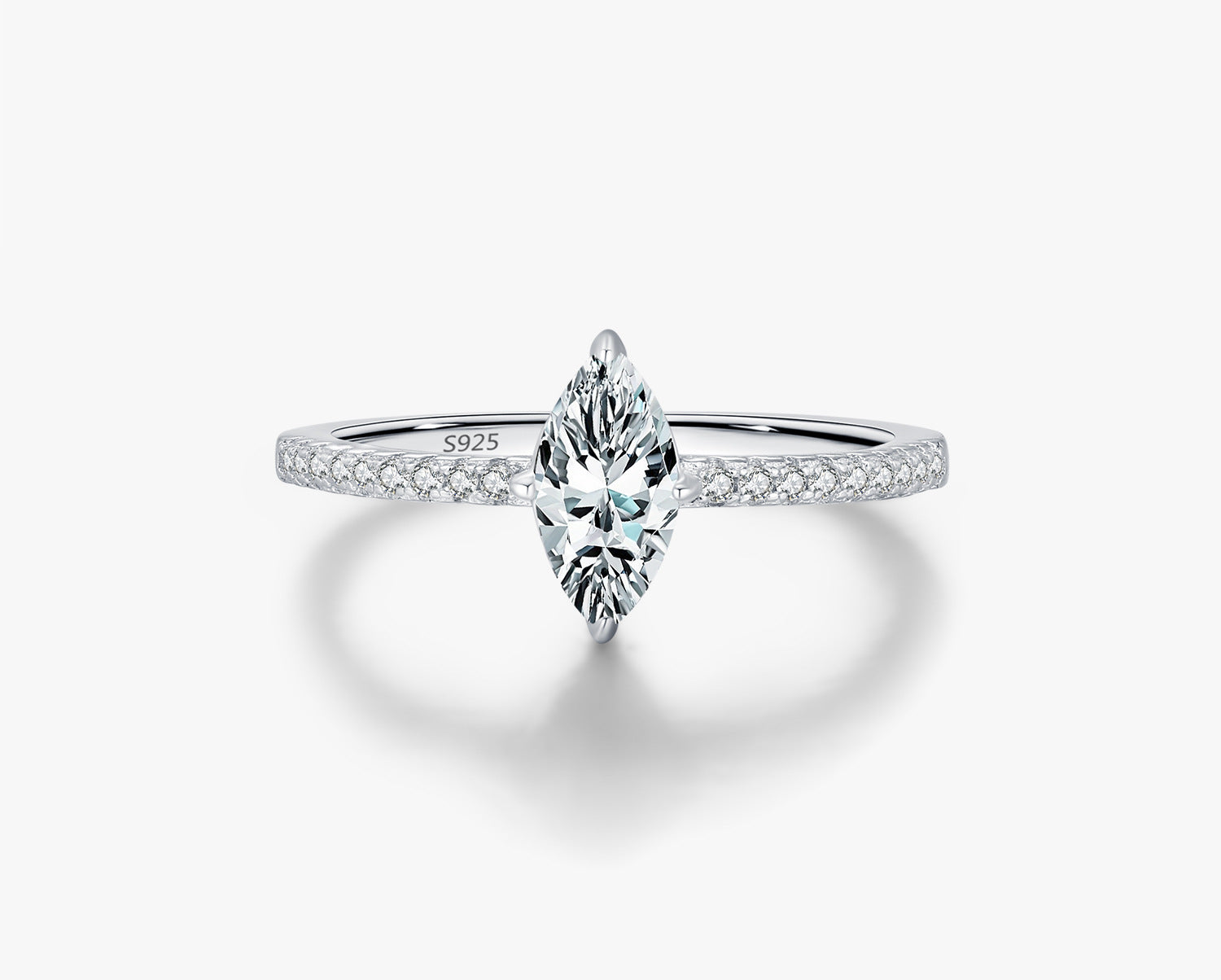 A refined marquise-cut moissanite ring featuring a luminous elongated center stone and pavé-set band. Crafted in polished S925 sterling silver, designed to enhance brilliance with a sleek, finger-lengthening silhouette.