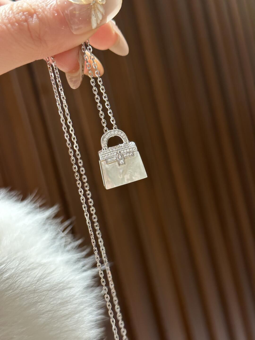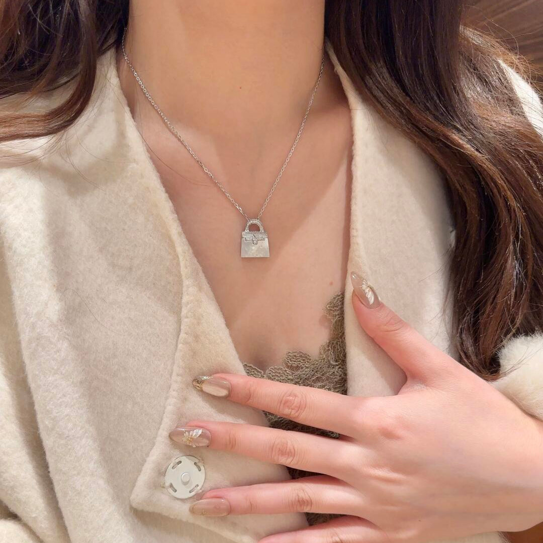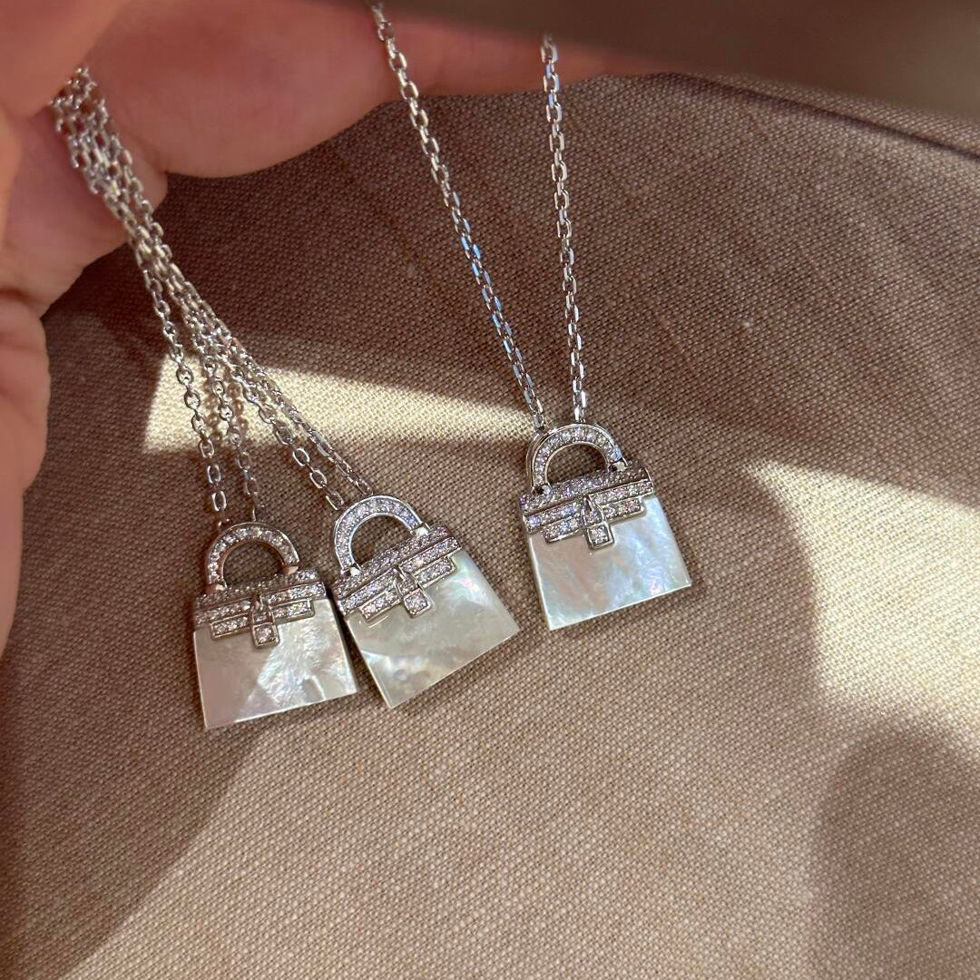 This mother-of-pearl handbag pendant necklace draws inspiration from fashionable handbags, seamlessly blending elegance with playfulness. The upper half of the pendant features intricately set zirconia stones that shimmer with a soft glow, while the lower section showcases natural white mother-of-pearl, revealing a unique iridescent texture that reflects noble light and shadow shifts from every angle.