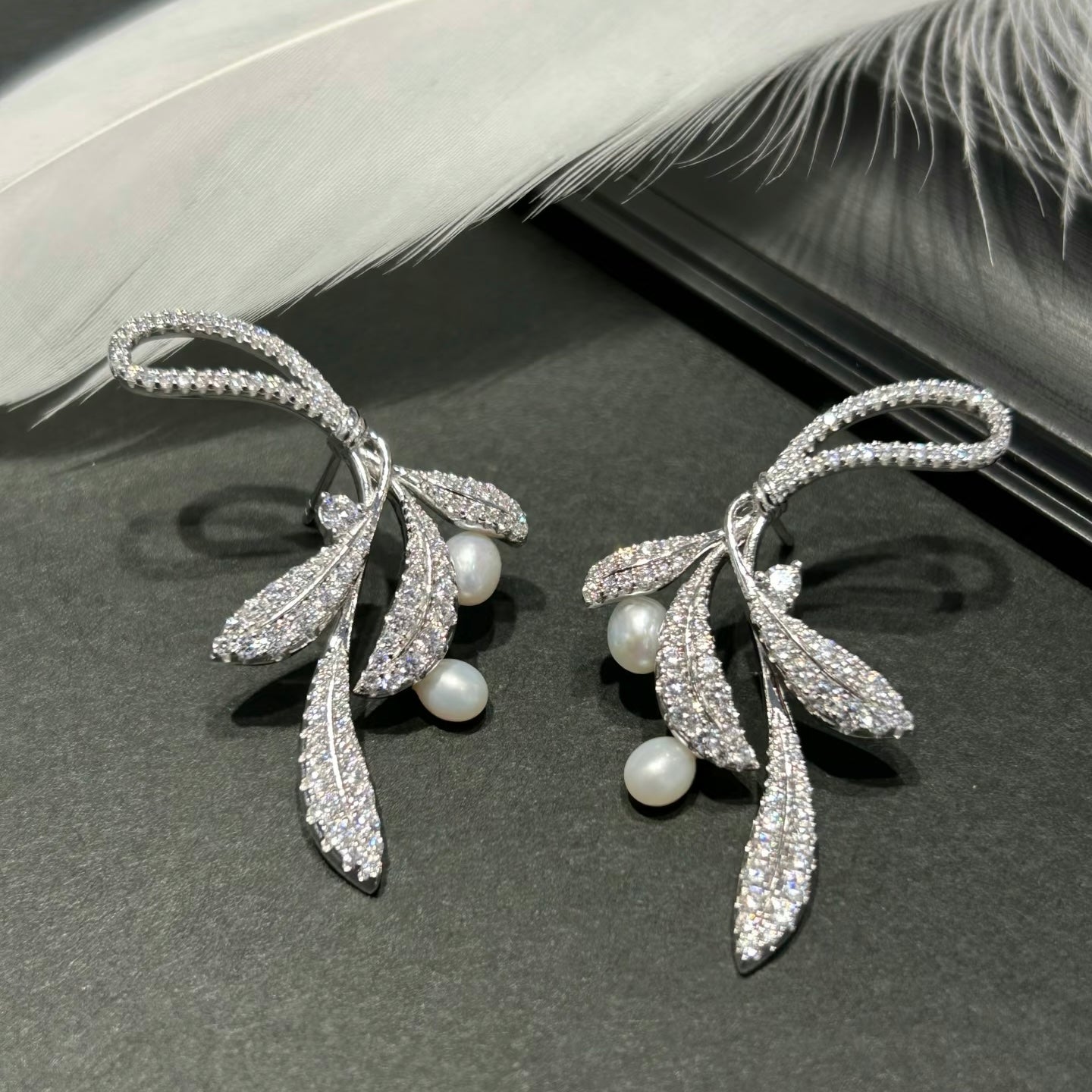 Inspired by the gentle beauty of nature, the Whispering Leaves Sterling Silver Pearl Earrings blend organic elegance with timeless craftsmanship. Each earring features shimmering zircon-studded leaves delicately intertwined with lustrous freshwater pearls, all set in fine 925 sterling silver. The flowing branch silhouette softly hugs the ear, adding a touch of poetic grace to any occasion.