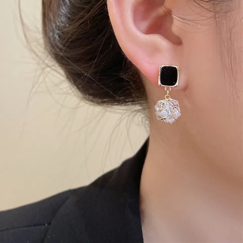 These black square patchwork multi-faceted zirconia earrings present a simple yet sophisticated design. The top half features black squares, a subdued and elegant texture, with a gold-colored border that highlights the nobility of the piece. The bottom half is made up of sparkling multi-faceted zirconias, which reflect the light and add a sense of splendor to the earrings. The overall design retains the contrasting beauty of the classic black color and zirconia, while the simple geometric shapes are modern and stylish, making these earrings suitable for a variety of occasions, especially as an accessory for a dinner party or a party.