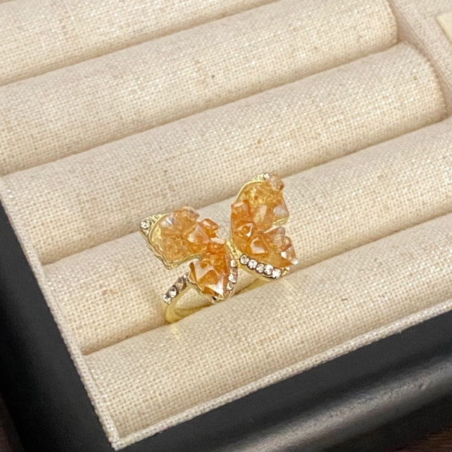 This butterfly zirconia ring is a perfect blend of natural spirituality and exquisite craftsmanship. The main stone is partly carved with highly translucent zirconia in the inspired shape of a butterfly wing, which is warm and translucent, reflecting the crystal light. Each wing is as light and vivid as a butterfly that is ready to fly. The ring is set with a row of small diamonds, dotted like morning dew, sparkling in the light.
