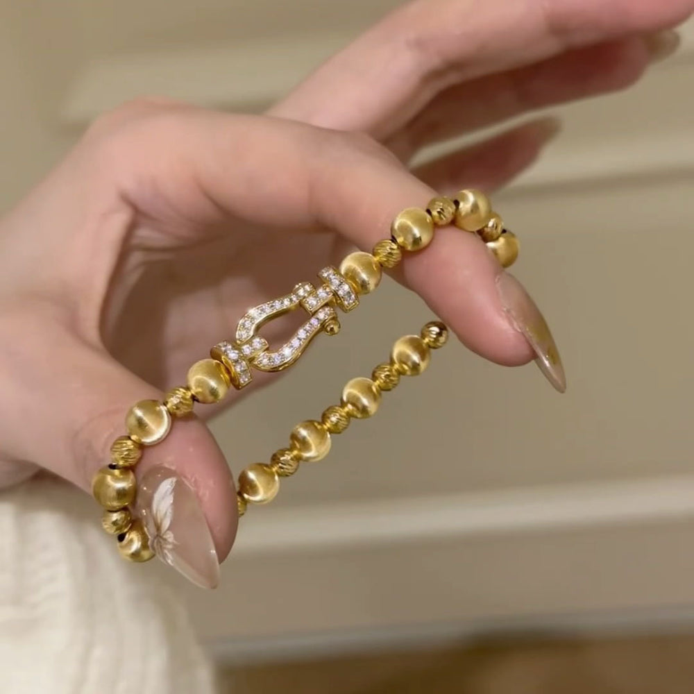 This stunning bracelet features a unique combination of cat's eye stones and a horseshoe-shaped diamond clasp. The cat's eye stones add a mystical, smooth glow, giving the bracelet an elegant yet subtle radiance. The horseshoe-shaped clasp is adorned with sparkling diamonds, making it the focal point of this piece.