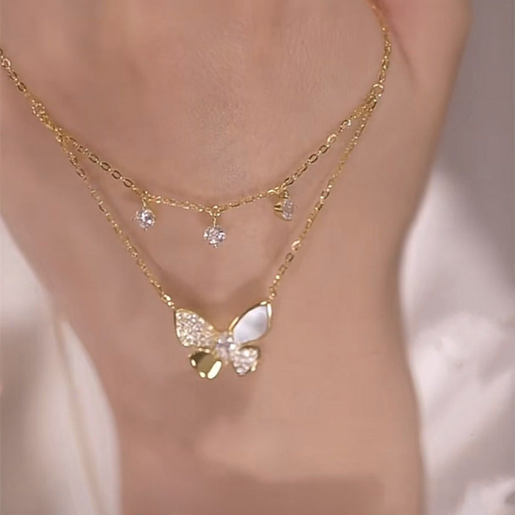 This double layered stackable zirconia shell butterfly necklace is both stylish and elegant for a variety of occasions. Its double-layered design makes it more flexible in terms of accessorizing and accentuates the sense of fashion and layering.