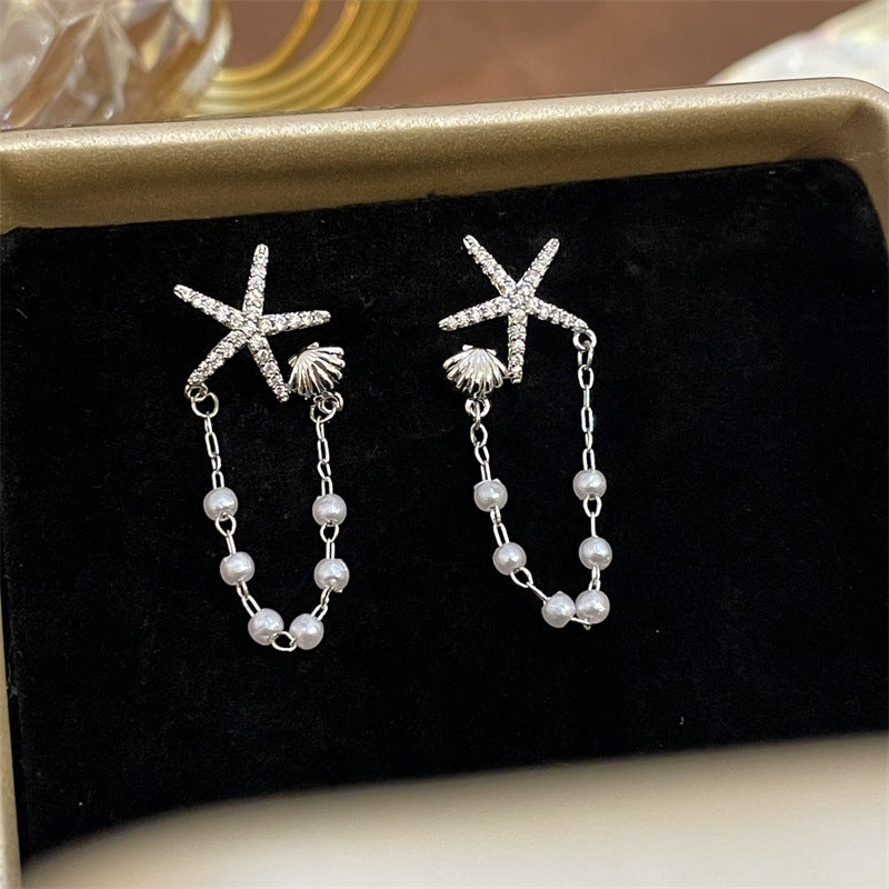 These earrings are inspired by ocean elements, showcasing a fresh and elegant seaside vibe. The top features a starfish design adorned with sparkling crystals, accompanied by a delicate shell for added texture. Hanging below the starfish and shell is a fine chain with small pearls, forming a graceful U-shaped pendant.