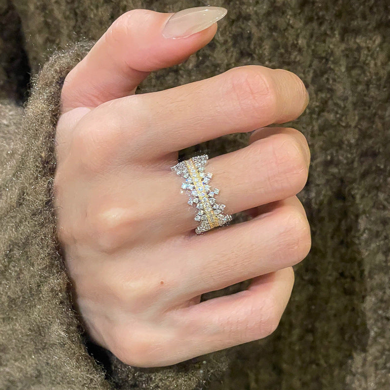Each piece of lace pattern has been finely polished, as if three-dimensional relief, delicate openwork design allows light to naturally penetrate, emitting a soft luster. The center of the ring is specially designed with a golden line, which is gorgeous and unique. Sparkling zirconias are carefully set at every point of the line, adding a sense of sophistication and refinement. The combination of gold and zirconia makes the ring even more sparkling in the sunlight. The crown design symbolizes dignity and elegance, as if a miniature crown is worn on the finger, every small detail reflects the ultimate craftsmanship.