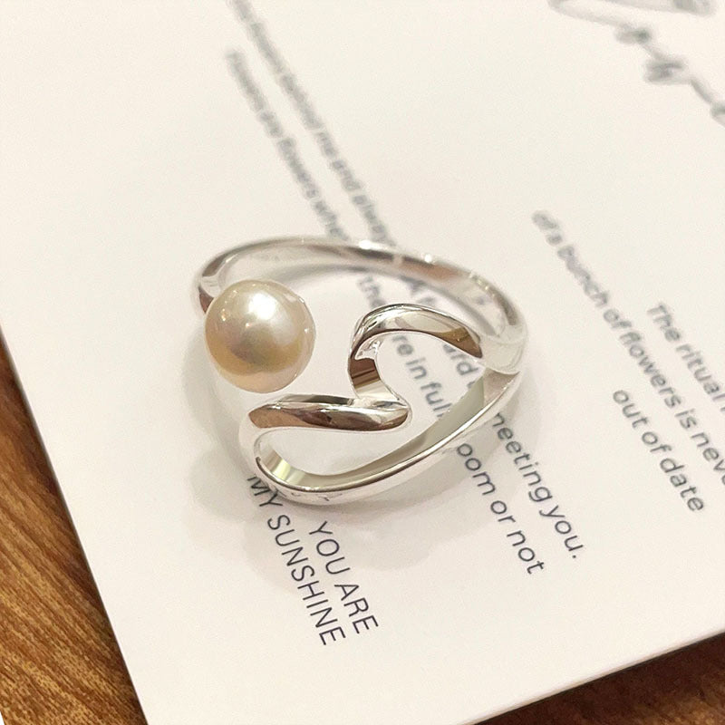 On the other end of the ring is set a delicate pearl, the luster and texture of which adds a touch of elegance and softness to the overall design. The natural beauty of the pearl complements the love element, showing a unique charm.