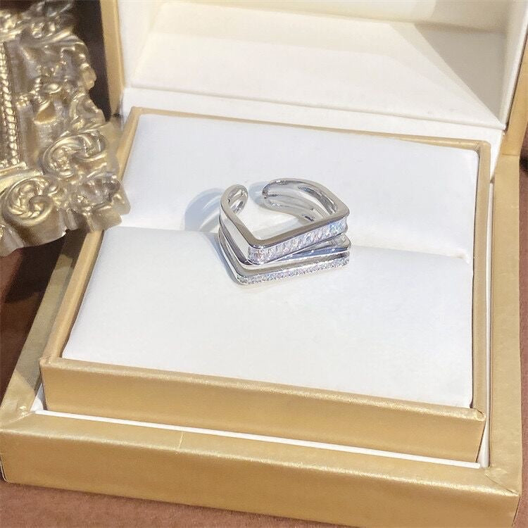 The Multi-Layered Square Ring is a stylish and sophisticated jewelry accessory featuring a multi-layered square design and micro-set zirconia, presenting a unique geometric aesthetic and sparkling visual effect.
