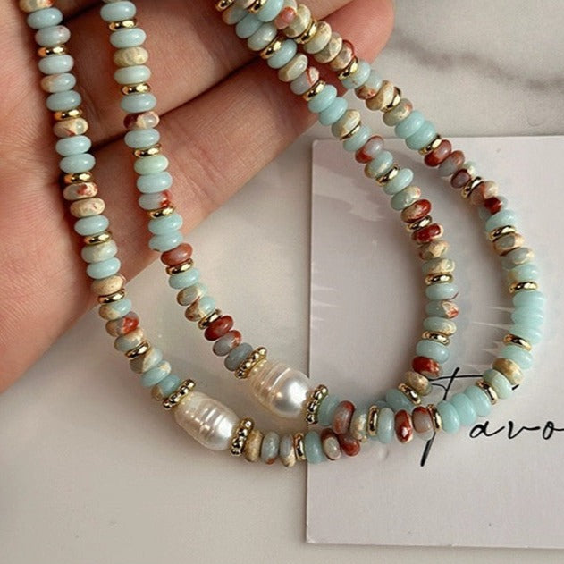 With its rich colors and natural materials, this natural stone colorful beaded pearl necklace is a perfect blend of natural beauty and elegance. The necklace consists of high quality freshwater pearls and natural jasper stones, each bead is carefully selected and polished to ensure its elegant appearance and comfortable wearing experience.