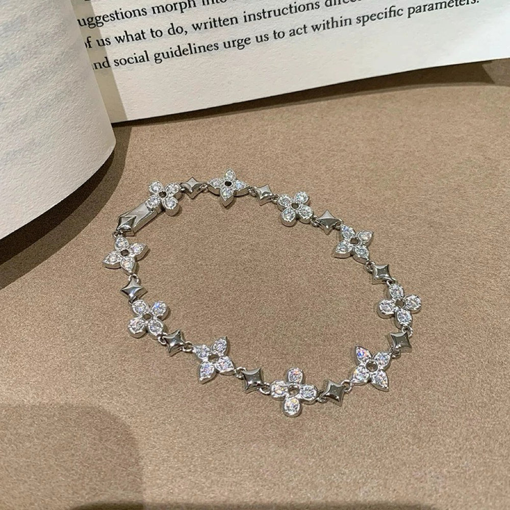 This is a beautiful bracelet designed with sparkling stones arranged in floral patterns. The bracelet features a combination of star-shaped and flower-like motifs, creating a sophisticated and elegant look. The pieces are delicately linked together, offering both charm and flexibility for a perfect fit on the wrist.