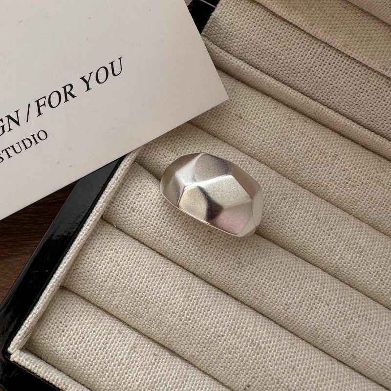 The defining feature of this ring is its multi-faceted diamond-shaped design, adding a unique geometric beauty to it. The use of 925 sterling silver ensures the ring's shine and texture while also ensuring its durability and resistance to oxidation.