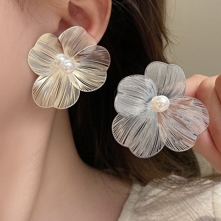 Showcasing a delicate design and elegant flavor, these silver openwork petal earrings combine the sparkle of silver with the softness of petals. Each pair of earrings consists of large silver openwork metal pieces that are three-dimensional and layered. In the center of each petal, a sparkling artificial pearl is set, adding a delicate sense of grandeur to the overall look.