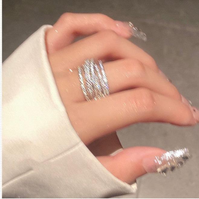 The ring is encrusted with sparkling zirconia stones, pave-set on the winding curves, as if flowing light around the finger, refracting the glamorous luster at different angles. The design of this ring balances artistry with comfort, and the twisted structure subtly conforms to the shape of the hand, making it ideal for everyday wear or evening gowns, showcasing the wearer's elegance and fashionable taste.