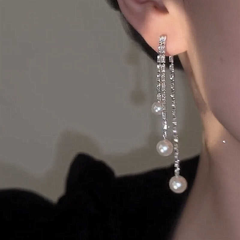 These pearl zirconia tassel earrings showcase a combination of romance and elegance with delicate zirconia as the main design element. The earrings feature a linear drop structure with multiple square zirconia stones strung together to create a visual gradient aesthetic. Each zirconia reflects the light for a luxurious look.