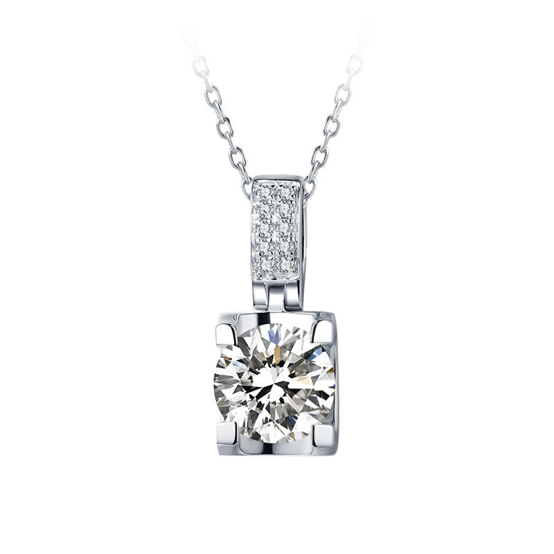 Clean, modern, and brilliantly simple. A round moissanite solitaire sits in a sleek square-prong basket, topped with a shimmering pavé bail. Crafted in 925 sterling silver with a radiant rhodium (white-gold tone) finish—hypoallergenic and made for everyday elegance.