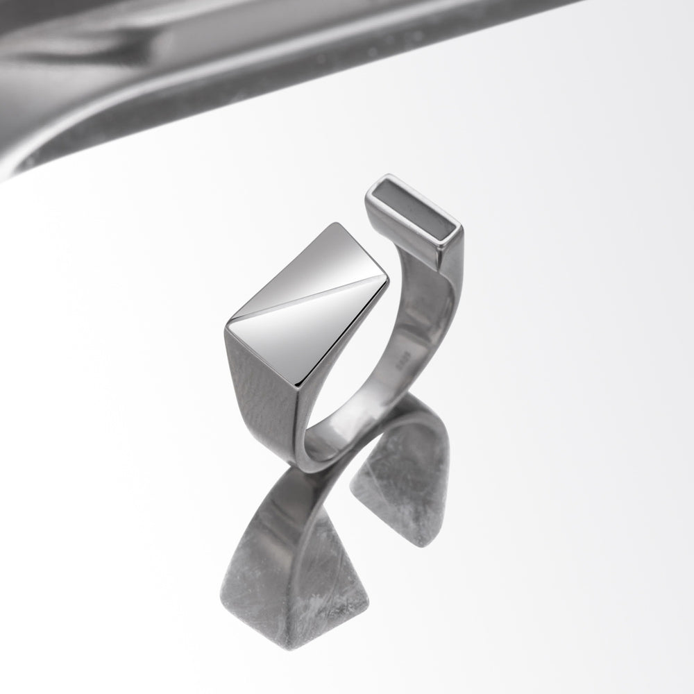 The top of the ring is an open design that forms a square geometric shape. This design not only adds to the uniqueness of the ring, but also provides some flexibility for the finger.
