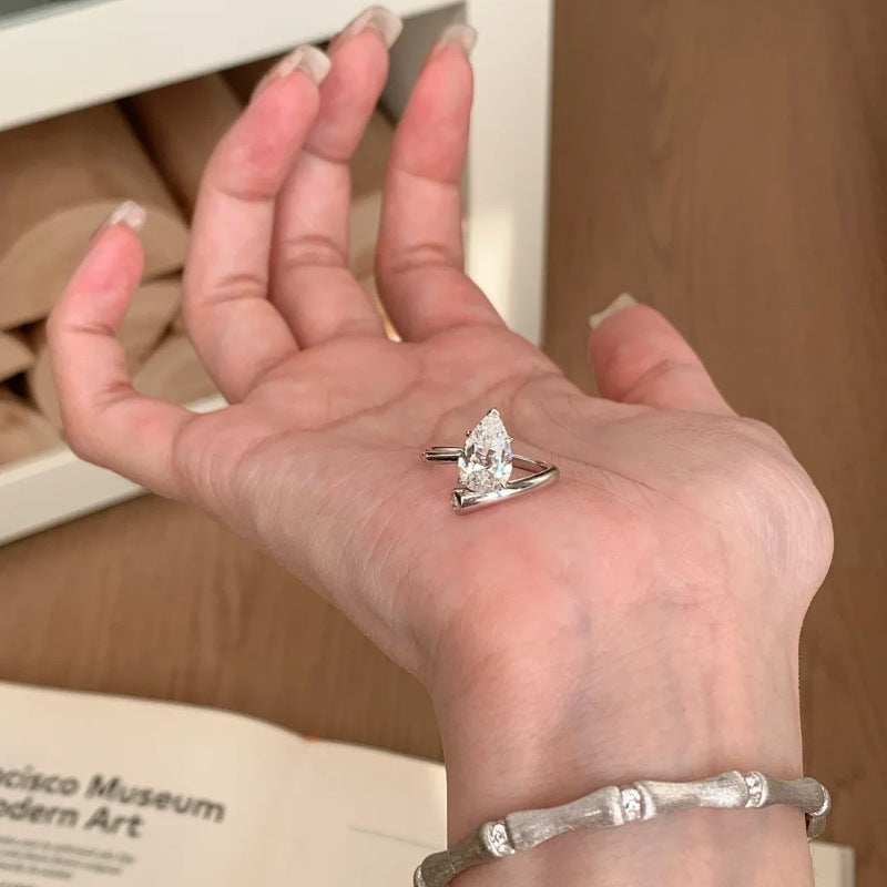 Sleek, sculptural, and brilliantly modern. A pear-cut moissanite is protected by a V-tip prong and cradled between two sweeping bypass arms. Hand-finished in rhodium-plated 925 sterling silver—bright, hypoallergenic, and made for daily wear or a timeless proposal.