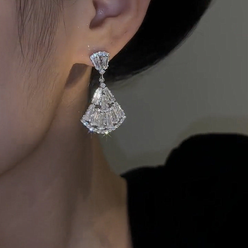 The dangle of the earrings is in the shape of a stunning skirt. This skirt is made up of many zirconia stones. The entire structure of the earrings resembles a gorgeous work of art, with every detail carefully crafted to present a high degree of sophistication and elegance.