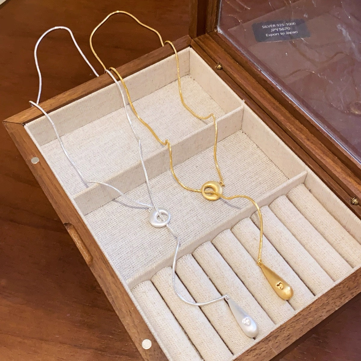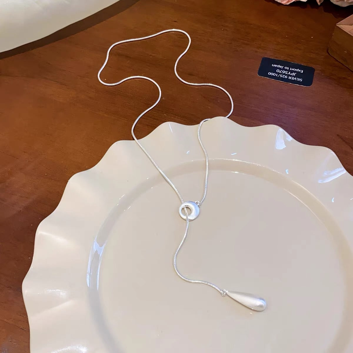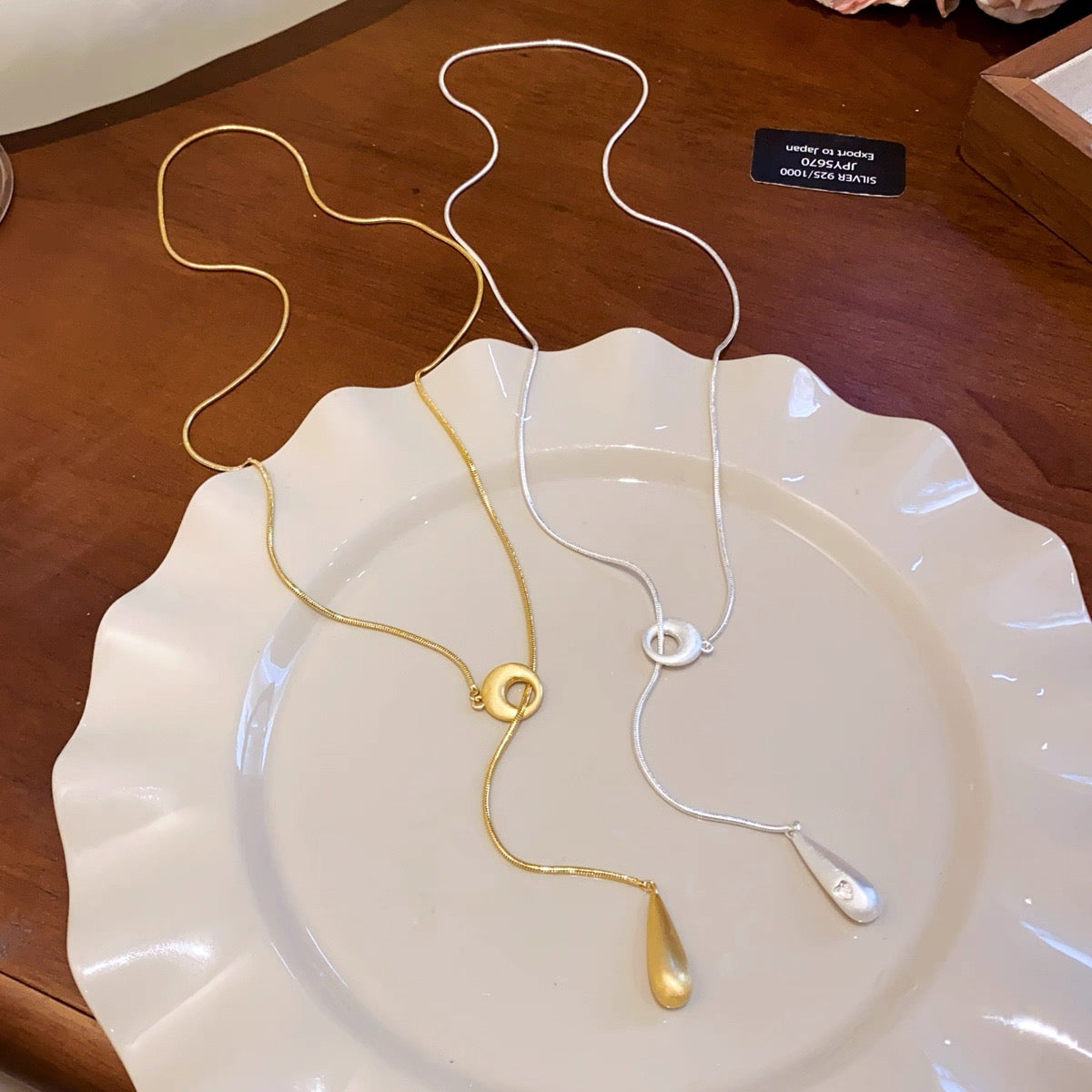 Design Highlights: Minimalist Y-chain, teardrop pendant, brushed metallic finish