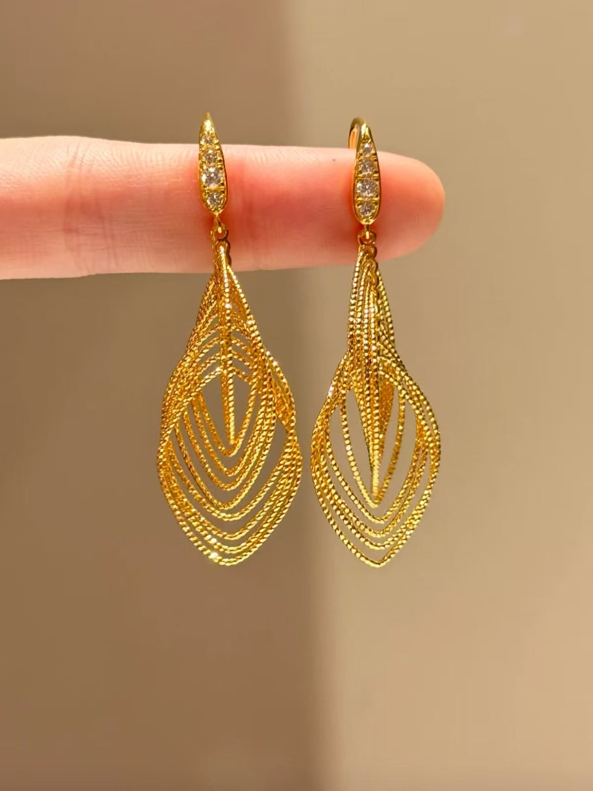 These Layered Geometric Leaf Drop Earrings are inspired by the natural elegance of leaves, reimagined with a modern geometric twist. The multi-layered openwork design creates a light, airy silhouette that catches and reflects light beautifully with every movement.
