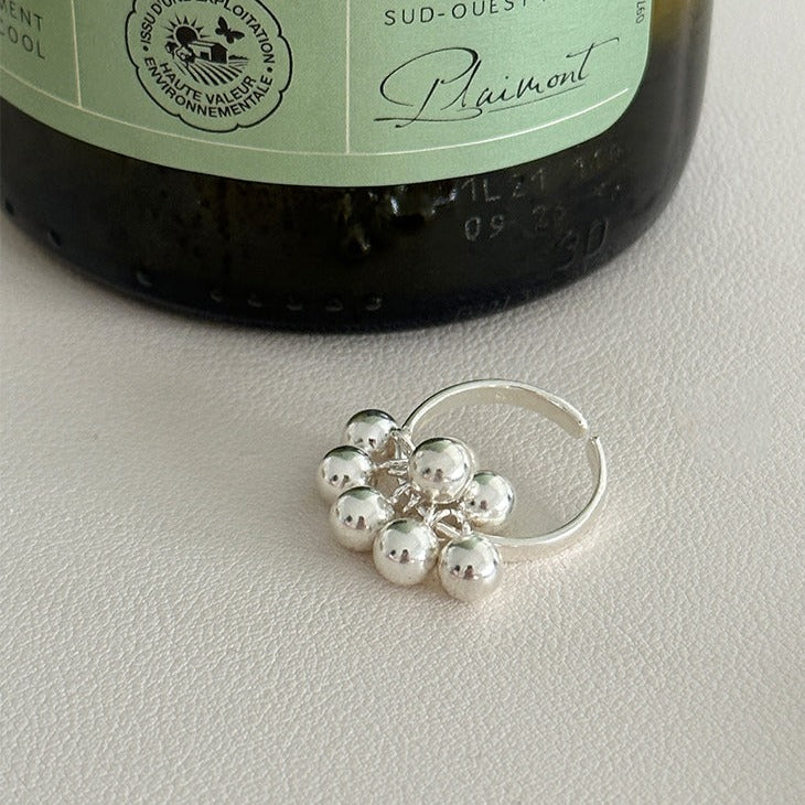 This sterling silver ring is a jewelry piece of great design and unique charm. It consists of several small sterling silver balls in the shape of a bunch of small grapes. Each sterling silver blob is carefully crafted to be smooth and shiny with a silvery white sheen.
