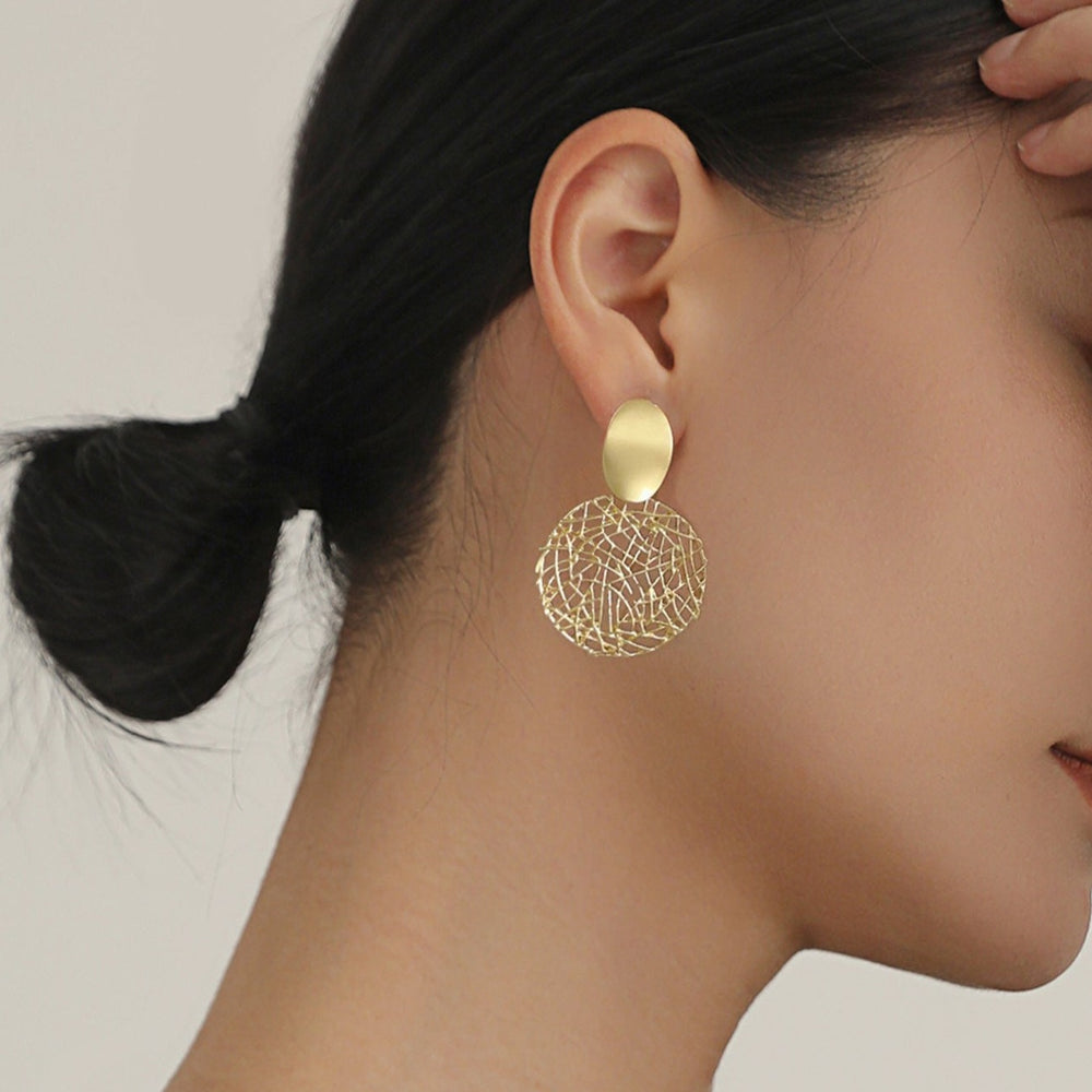 Each earring is composed of a round disc as the main element. Crafted from high-quality metal, the round disc showcases a suspended circular cutout pattern. This cutout pattern adds a sense of lightness to the earring and contributes to the overall modern aesthetic. The contrast between the circular stud and the dangling circular cutout creates an interesting visual dynamic, adding intrigue and a modern flair to the design.
